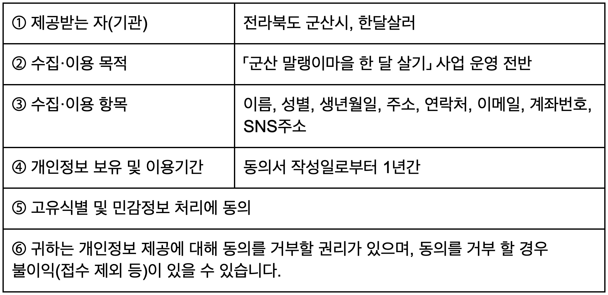 신청서에 작성한 본인 및 팀원 모두는 군산시가 「개인정보보호법」제15조(개인정보의 수집·이용) 및 제17조(개인정보의 제공) 규정에 의거하여 다음과 같은 목적으로 개인정보를